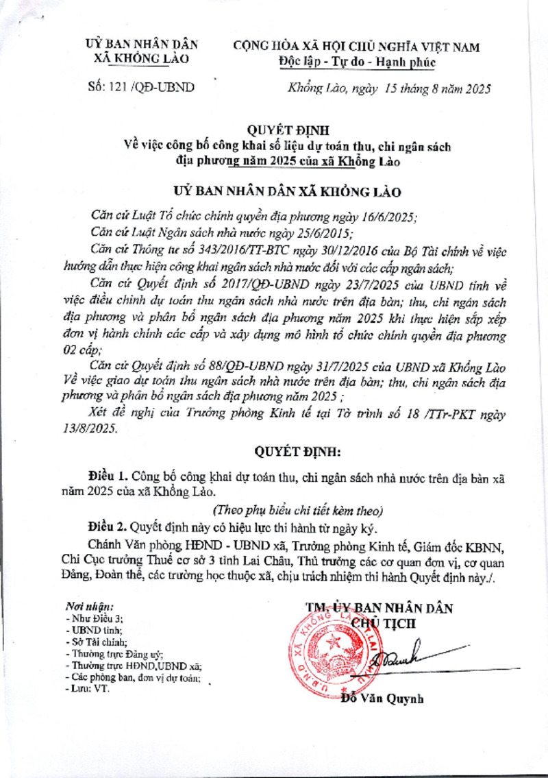 1 | Quyết định | Quyết định số 121/QĐ-UBND | Quyết định về việc công bố công khai số liệu dự toán thu, chi ngân sách địa phương năm 2025 của xã Khổng Lào | 15/08/2025 | Ủy ban nhân dân xã Khổng Lào | ||