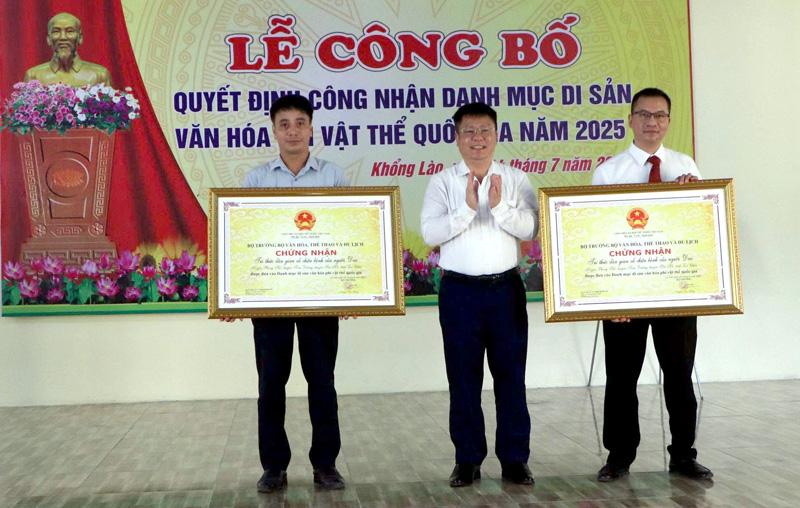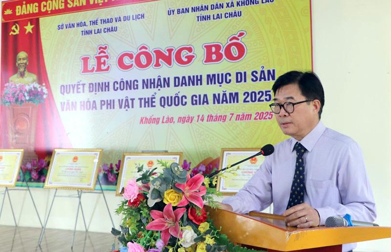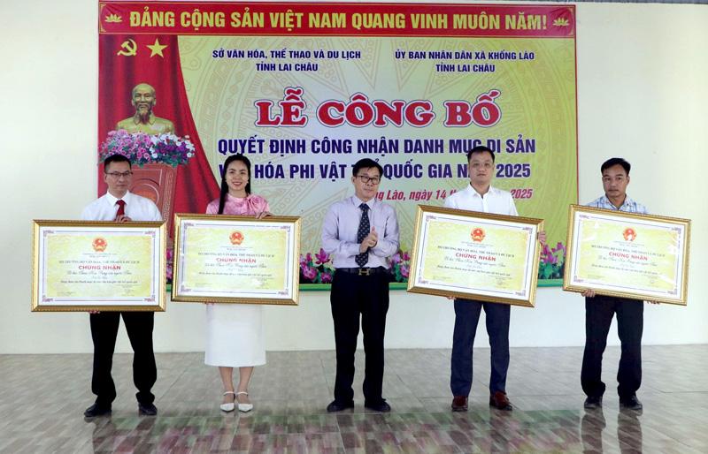 Tại buổi lễ, Ban Tổ chức đã công bố quyết định và trao chứng nhận cho các địa phương có 4 di sản được đưa vào danh mục di sản văn hoá phi vật thể quốc gia gồm: Lễ hội Then Kin Pang dân tộc Thái tỉnh Lai Châu; Tri thức dân gian về chữa bệnh của người Dao huyện Phong Thổ, huyện Tam Đường, huyện Sìn Hồ (cũ); Ẩm thực dân tộc Thái tỉnh Lai Châu; Lễ Cấp sắc của người Dao tiển huyện Phong Thổ, huyện Tam Đường, huyện Sìn Hồ (cũ). Trong năm 2025, tỉnh Lai Châu có 8 di sản được Bộ Văn hoá, Thể thao và Du lịch công nhận là di sản văn hoá phi vật thể quốc gia, nâng tổng số lên 13 di sản văn hoá được ghi danh, công nhận trên địa bàn tỉnh. Trong đó, có 2 di sản được UNESCO ghi danh là di sản văn hóa phi vật thể của nhân loại và 11 di sản được Bộ Văn hoá, Thể thao và Du lịch công nhận đưa vào danh mục di sản văn hóa phi vật thể quốc gia…