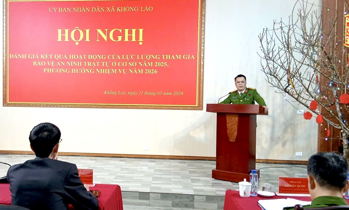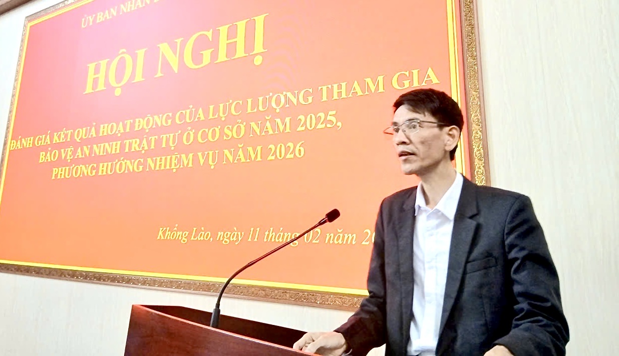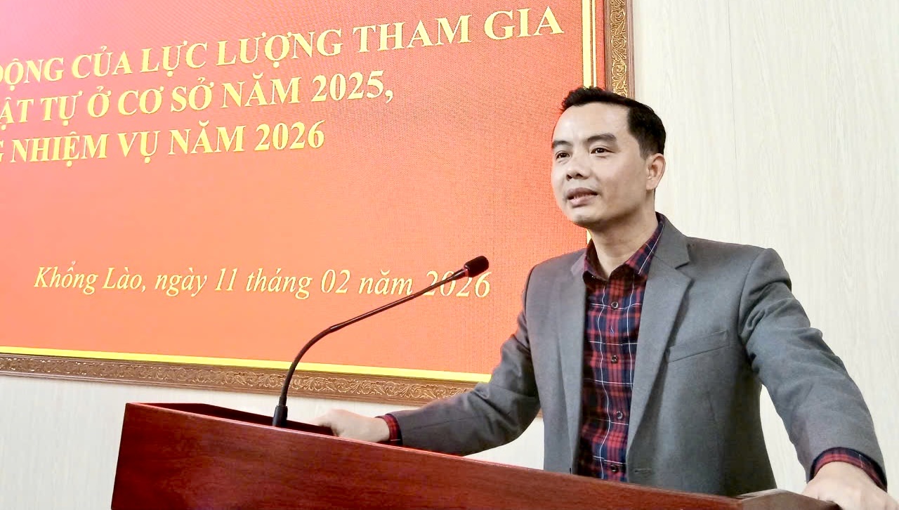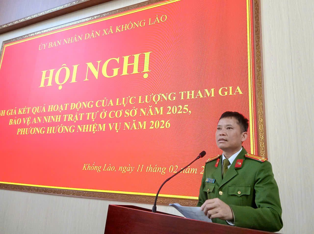 Chiều 11/2, UBND xã Khổng Lào tổ chức Hội nghị đánh giá kết quả hoạt động của lực lượng tham gia bảo vệ an ninh trật tự ở cơ sở năm 2025, đề ra phương hướng năm 2026. Dự Hội nghị có các đồng chí: Lê Trí Kiên – Phó Bí thư thường trực Đảng ủy xã; Nguyễn Văn Lương – UVBTV Đảng ủy, Phó Chủ tịch UBND xã.